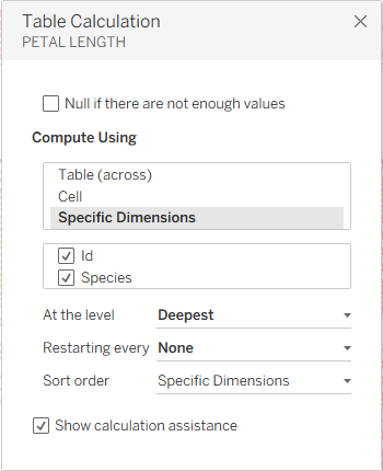 You’ll notice the lines shifted because the table calculation is restarting for each species — which we don’t want. To fix this, edit the table calculation for each measure on the Measure Values shelf by selecting Edit Table Calculation. Under Compute Using, select Specific Dimensions, then check Species (and keep ID checked). The lines should snap back into their correct positions.