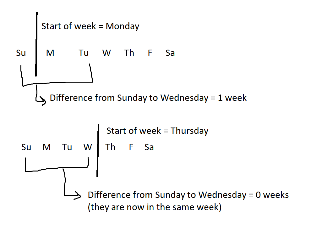 Finally, it's good to remember that variables in square brackets - [start_of_week] above - are optional. This means that they aren't necessary for the calculation to work, but can be provided for extra granularity. In this case, the start_of_week defines just that. However, this can potentially affect calculations in a way you might not be expecting, as shown in the example below.