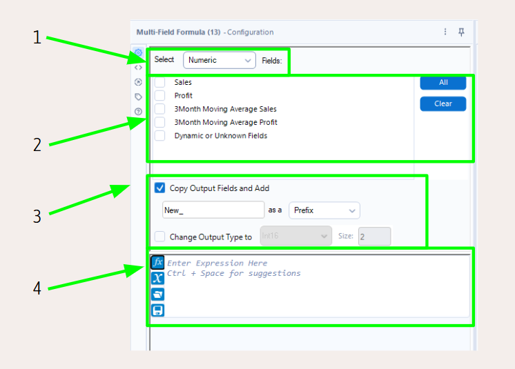 When you connect the Multi Field Formula tool, this configuration window will pop up on the side of your screen: