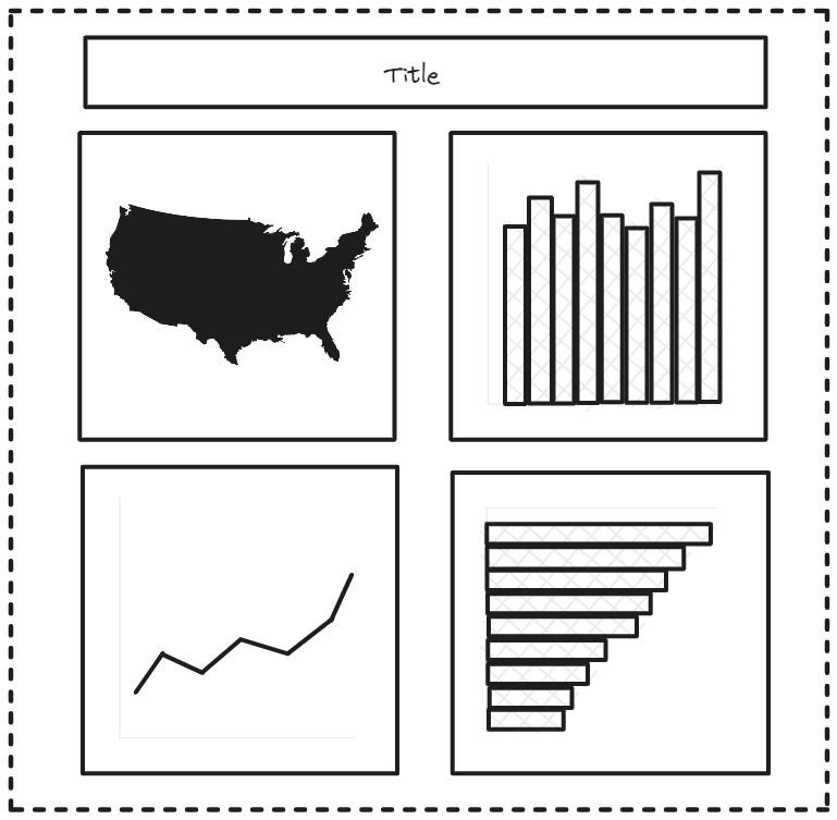 For instance, suppose we aim to construct a dashboard incorporating the charts and elements presented below. To achieve a cohesive layout, we can employ containers to group them together effectively.