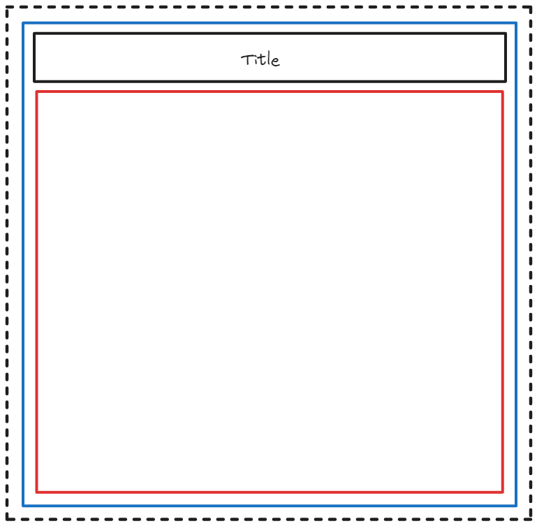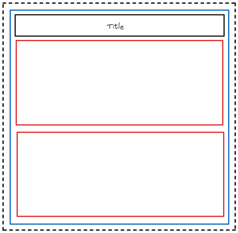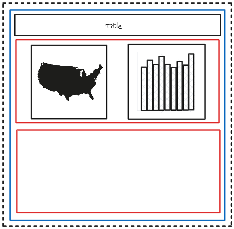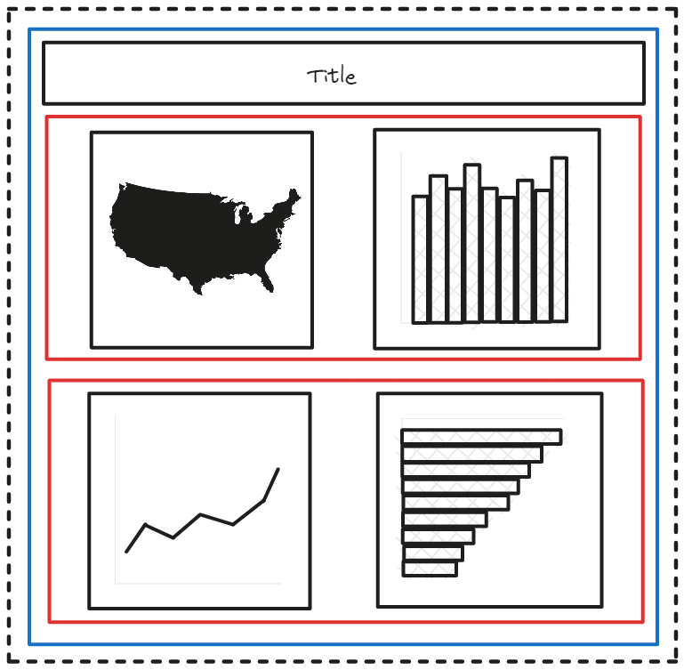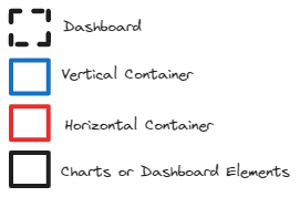 To help illustrate the concept, we will use sketches for how containers can be used in Tableau. As shown in the figure below, the dotted black box represents the dashboard itself, the blue box represents a vertical container, the red box represents a horizontal container, and the black box symbolizes a chart or element.