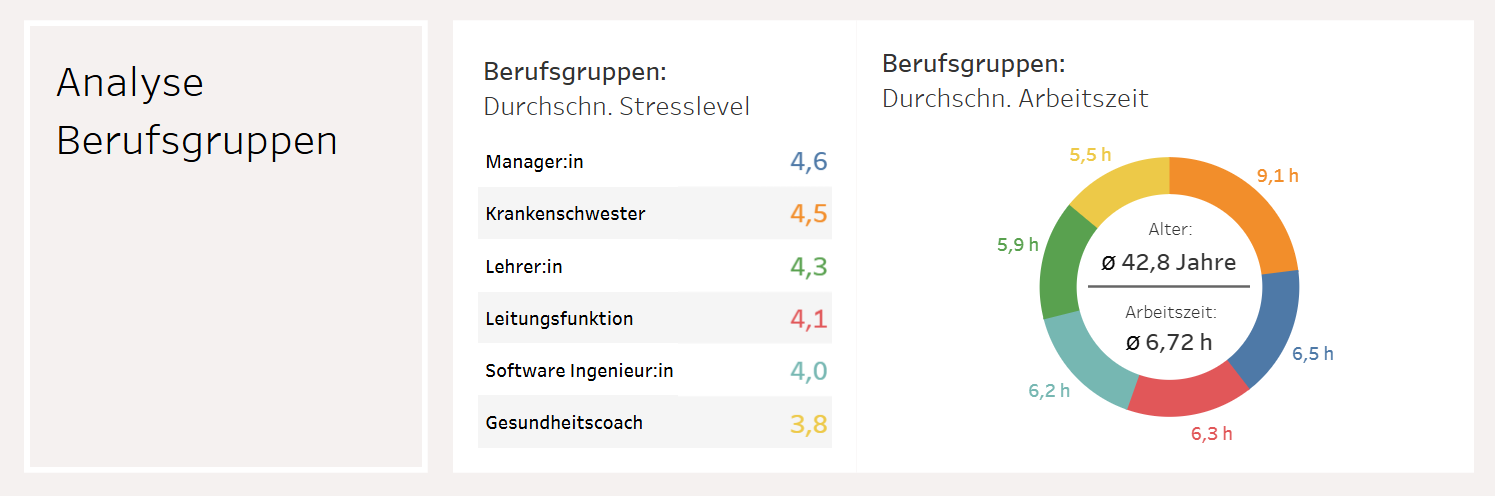 To provide a good overview, I had originally assigned a color to each professional group. The stress levels were sorted in descending order. To show a potential correlation between stress levels and working hours, I placed a donut chart with average working hours on the right side. For comparison, I displayed the average age and average working hours of the entire dataset inside the donut. In principle, different proportions are difficult to compare in a donut chart, which is why I had specified the values in hours (h) in my original version.
