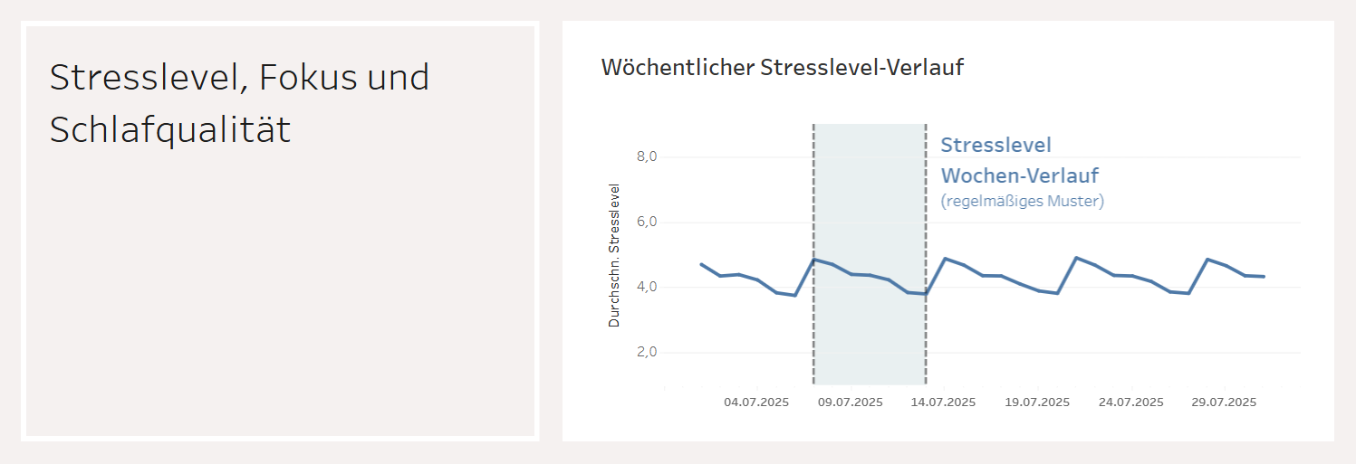 In my final diagram, I mapped the weekly stress progression. Again, a quick note that these are average values and individual stress patterns can vary greatly. The data used comes from a synthetic dataset from Kaggle and offers little insight into reality. In this case, I was able to identify a regular weekly pattern in the existing dataset, which I highlighted in color and labeled for one exemplary week.