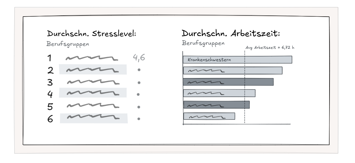 In the new version, I added numbers from 1 to 6 to the ranking to make it clear that this is a sorted sequence. I replaced the donut chart with a horizontal bar chart. Based on the bar length, working hours can be compared much more effectively. I placed the labels for the professional groups directly on the bars. The average working time is represented in the form of a vertical, dashed reference line.