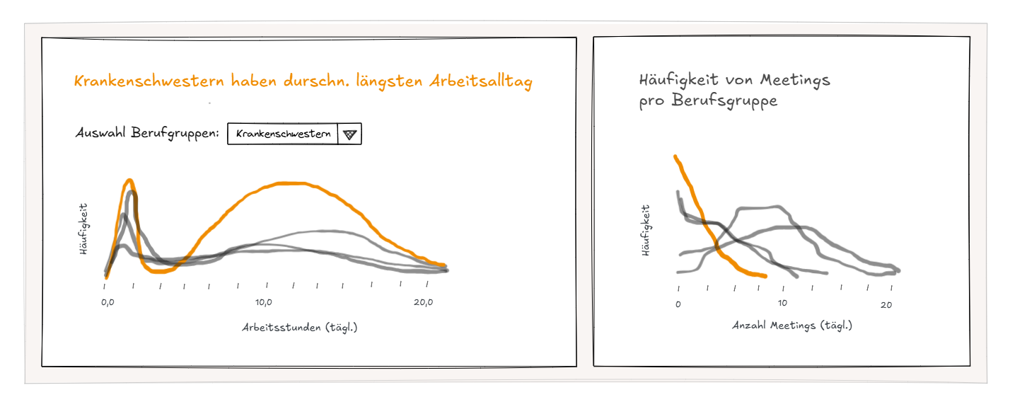 In my second post, I’m going to take a closer look at one of my own dashboards and consider what improvements can be made. The following three visualizations are part of my dashboard on the topic of productivity in connection with work-life balance. For the redesign of my diagrams in sketch style, I once again used Excalidraw.