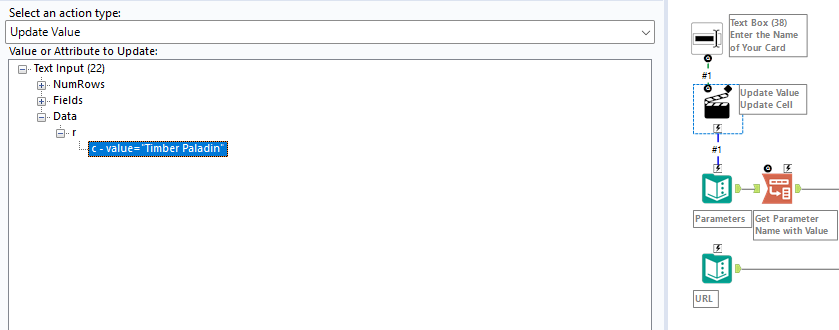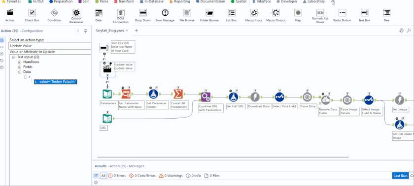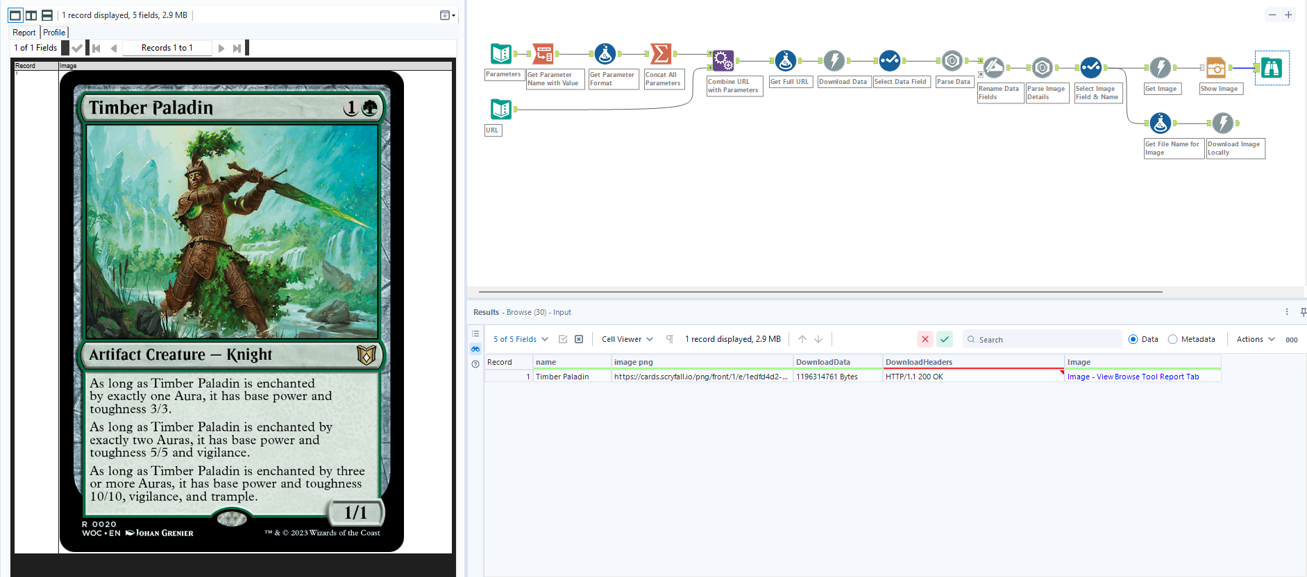 The first thing to do when building an Alteryx App is to build the workflow that will be eventually converted into an App. This includes having some default values that will be replaced by the user input. For this task, I want to be able to see and download the image of a card provided. This can use the basis of the previous workflow, changing the URL provided to match the new one used for this request.