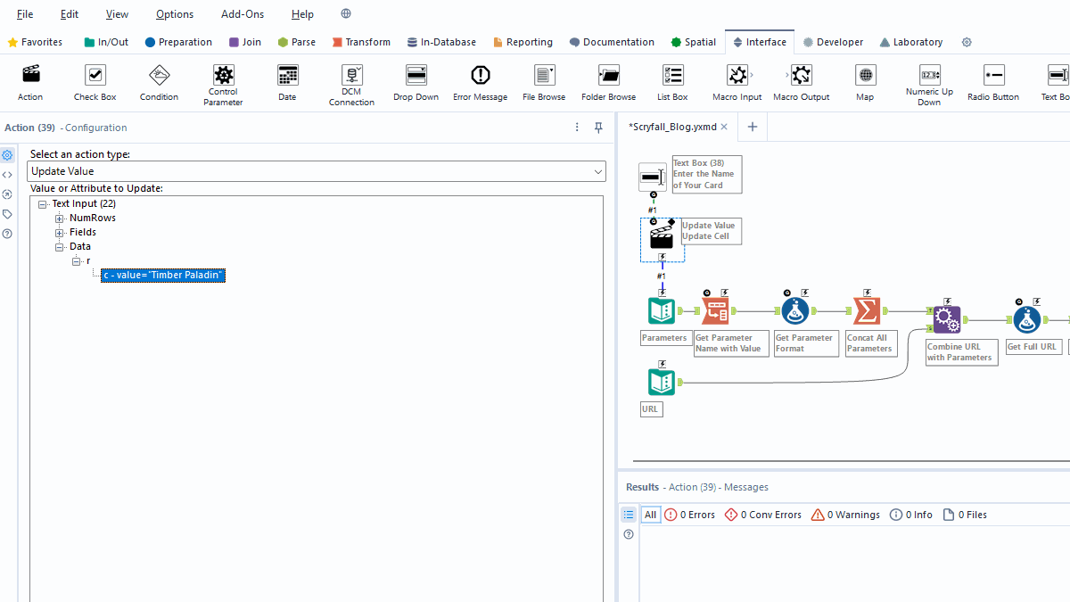 We can use the Action tool to determine how the Interface tool will interact with the Text Input that is being used for the parameter. The Action tool has several different ways it can be used, but here we will be updating a specific value. Here we can navigate through the different details about the Text Input and select the value we want to update with the Text Box result.