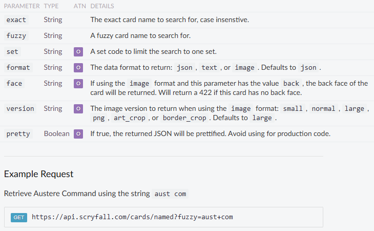 With the /cards/named request, there are various different parameters that we can append onto the URL to change the response that we get from the server. They are documented well here, showing what the different possible options are for the parameters.