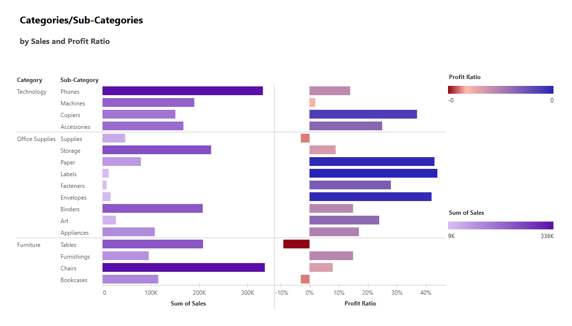 This view compares product performance. Copiers, Phones, and Accessories were the most profitable sub-categories, while Tables and Bookcases had high sales but negative profit.