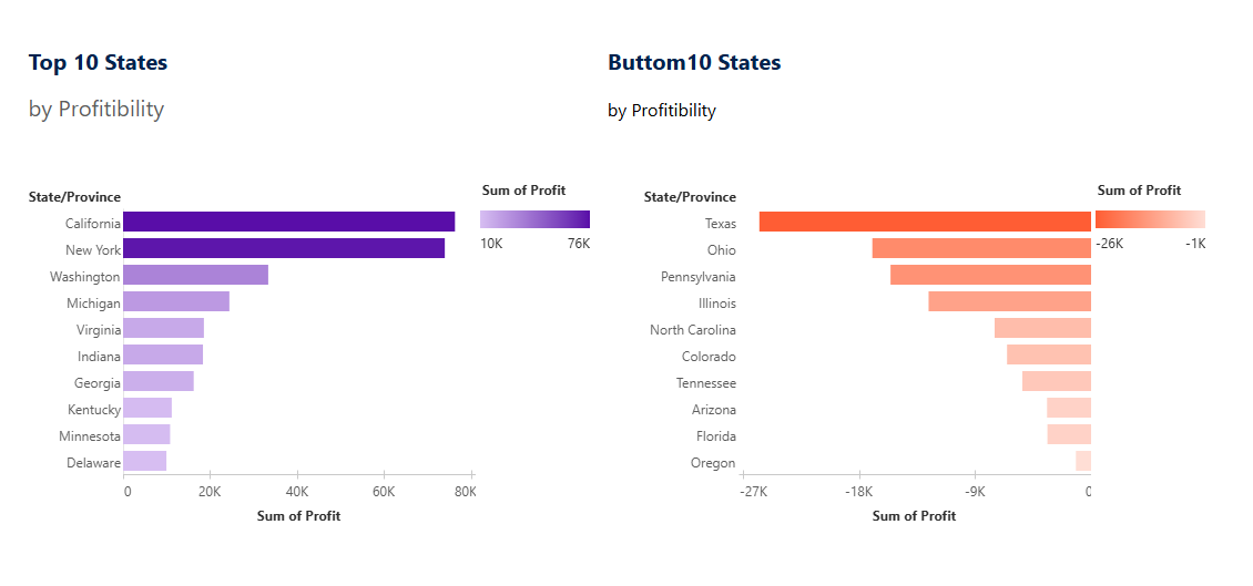 California and New York lead in profit, whereas Texas and Ohio consistently lose money.