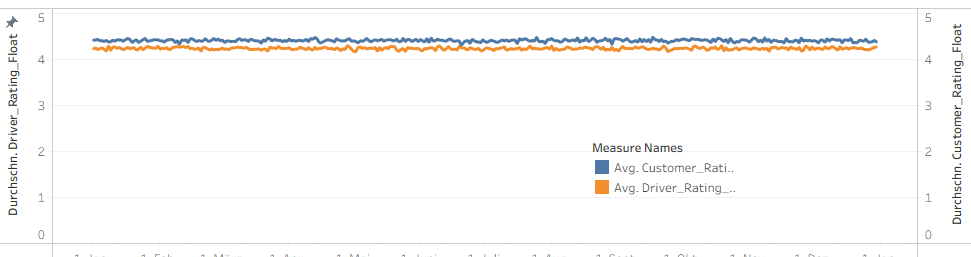 Driver and customer average ratings were always between 4.2 and 4.5 without changes in all days of a year. Moreover, it was like, that both curves for customer and driver moved together with an offset during a year.
