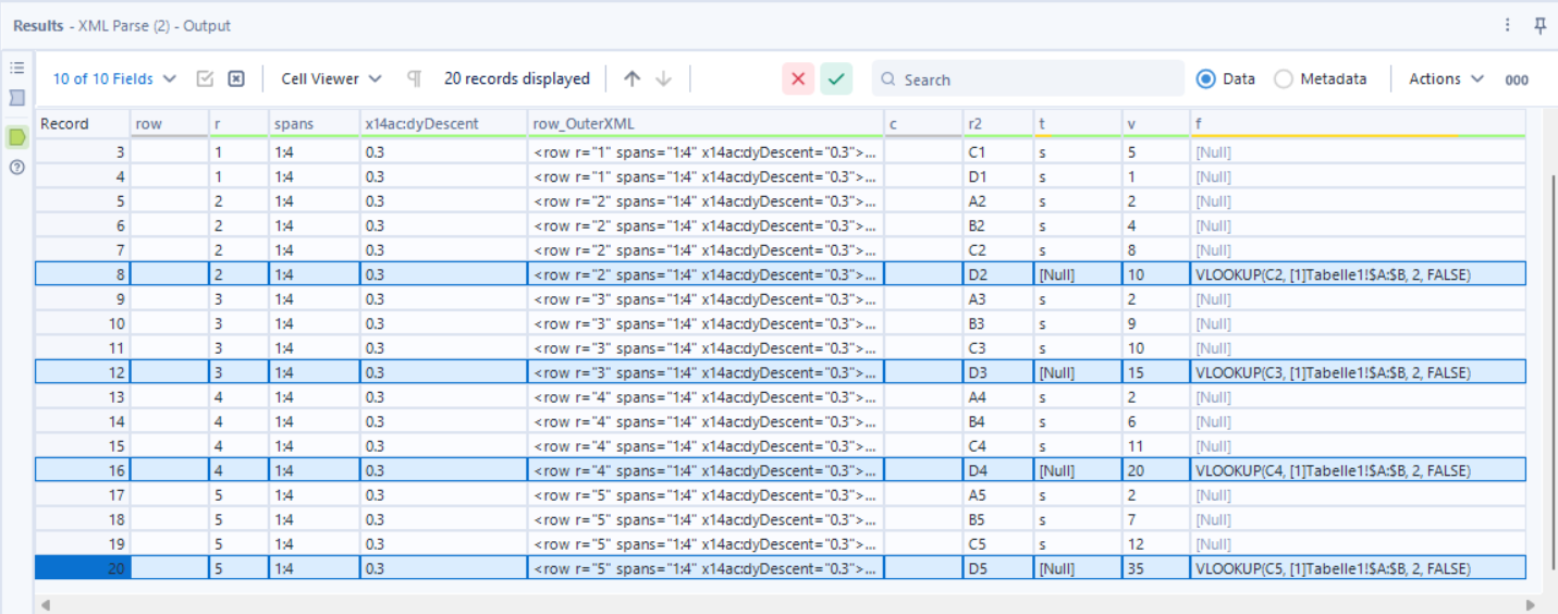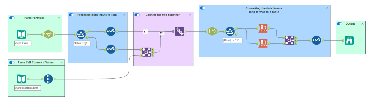 You can use the Alteryx workflow below to see how to connect your formulas to the rest of the cell contents from the sharedStrings.xml file.
