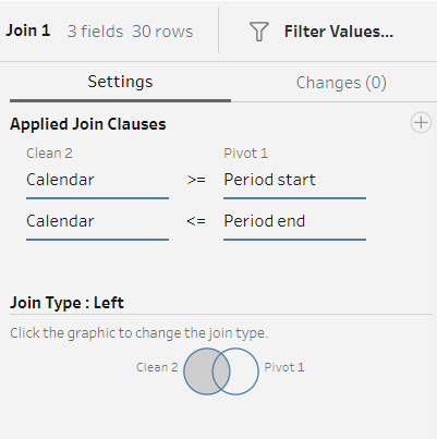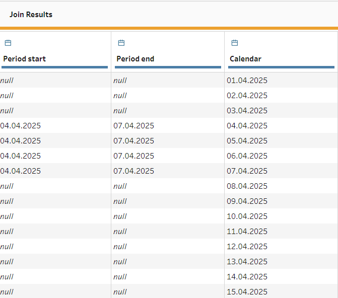 Now, we should join the period data to the calendar and highlight the interval between the start and end dates. For that, we will use an unusual join.