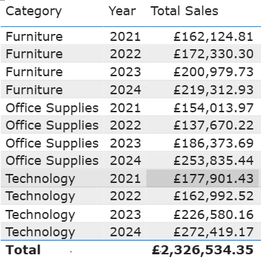 For example, lets imagine we wanted to look at the total sales for each of our product categories across each year. If we just added these three fields into our table, as expected, we would get a distinct total for each category and year. As seen below:
