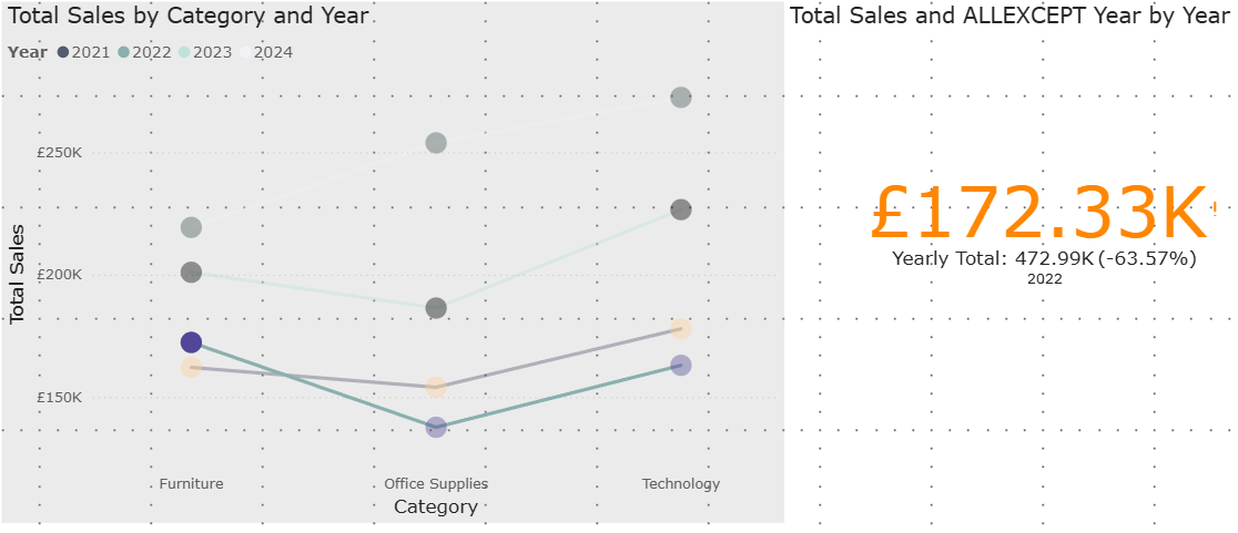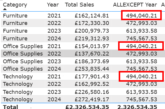 But what if I then wanted to see how each of these values compared to the total sales for each year regardless of category. To do this I would want to remove all other 'filters' (e.g., product category) that are affecting my value apart from 'Year'. We can do that using this calculation: