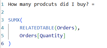 To demonstrate how we can use the RELATEDTABLE function, lets imagine that want to know how many products each of my customers have ordered from me? However, both my customer information and order details sit in two separate tables.