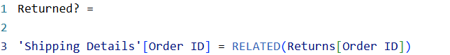 To do this, I can use the RELATED function to create a new Boolean column that will tell me whether the order has been returned or not in my “Shipping details” table: