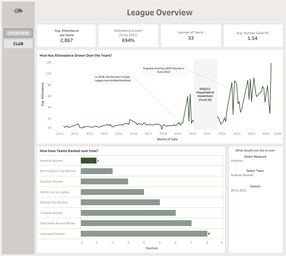 - The "League Rise" (Overview): Focuses on the larger story - the 694% growth in average attendance since 2011, visualised with a line chart and annotations for key moments like the 2022 Euros that drove the surges in popularity of the sport.