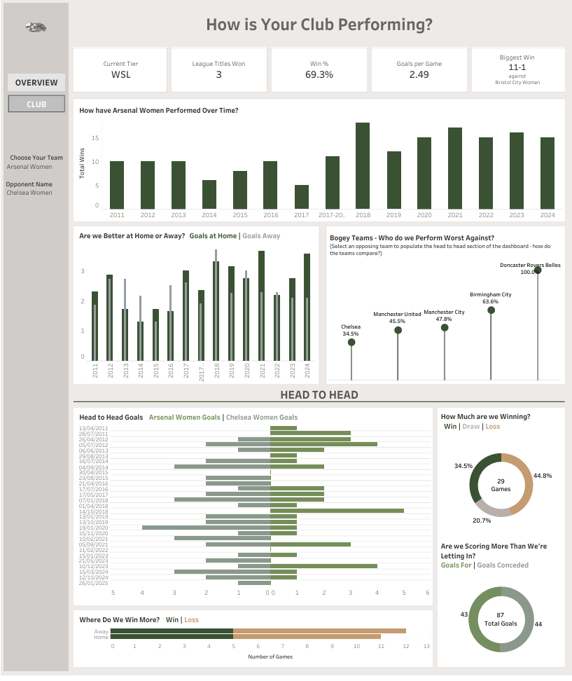 - My initial User Story for Dashboard 1 was ambitious - I wanted to visualise the growth of the League to show how the WSL has evolved over time. However, I realised the dataset was mostly performance-based (goals, results, standings). Aside from a single column for attendance, there was no financial, broadcast, or commercial data to support a comprehensive "League Growth" narrative. I learned that a compelling User Story is useless if the data doesn't exist to back it up, and I should have thought this through more before beginning to build.