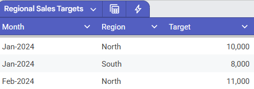 10,000for "Jan-2024" will be duplicated 500 times—once for every single "North" transaction in January. - The "North" target of