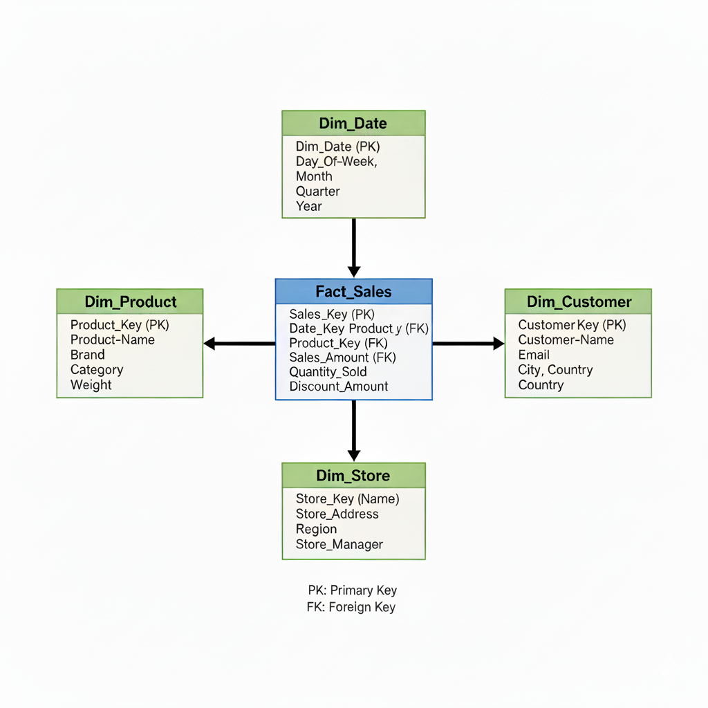 Sales_Amount,Quantity_Sold). Its grain is usually "one event." - Multiple Dimension Tables: These tables surround the fact table. They contain the descriptive, lower-granularity attributes (the "who, what, when, where," like