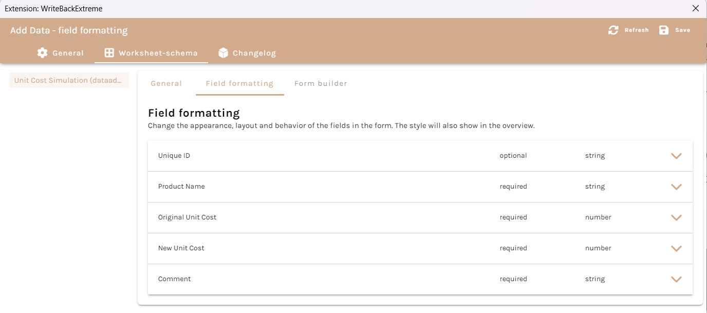 For the Unit Cost schema I created 5 fields: Unique ID, Product Name, Original Unit Cost, New Unit Cost, and Comment.
