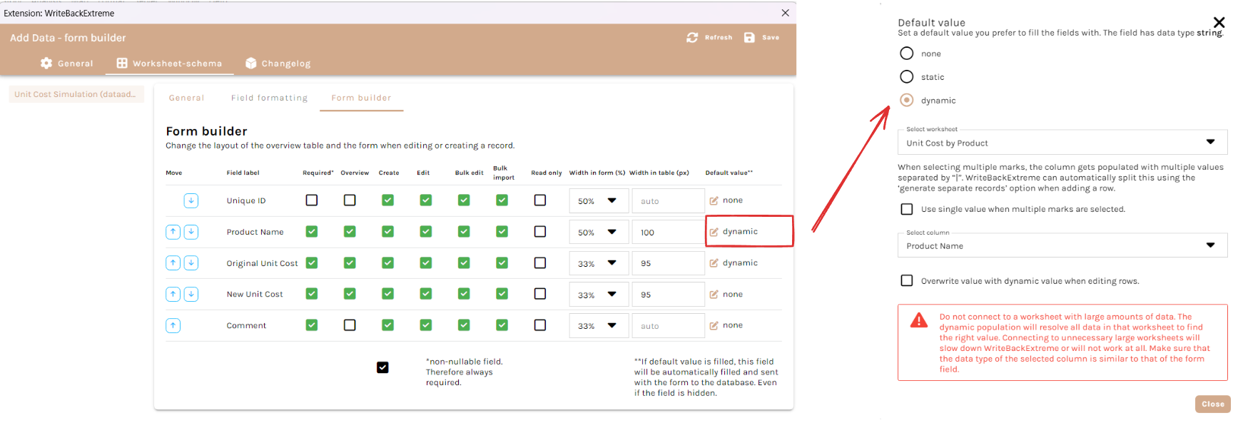 So in the form builder, under "Default value" change it from none to dynamic and then select the relevant worksheet and select the column you would like it to pull the data from. In my case, this is supposed to be adding data to my Unit Cost by Product chart and I'd like both the Product Name and Unit Cost to autofill.