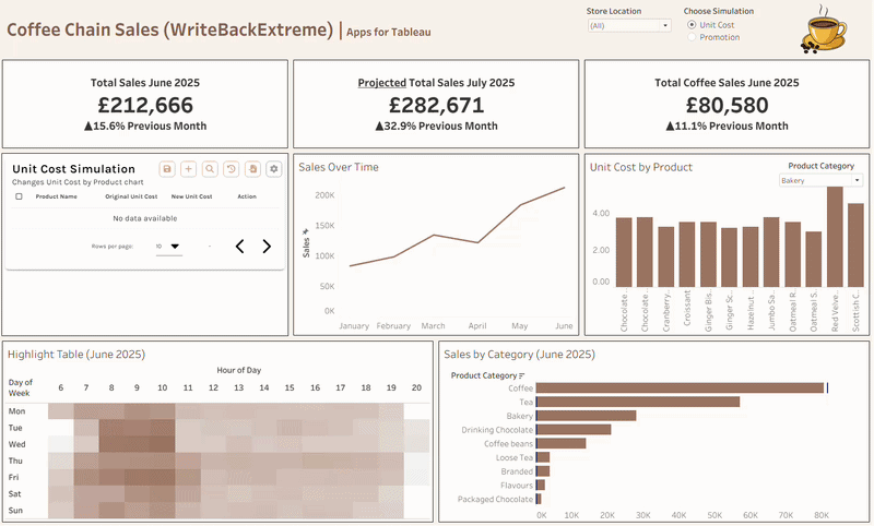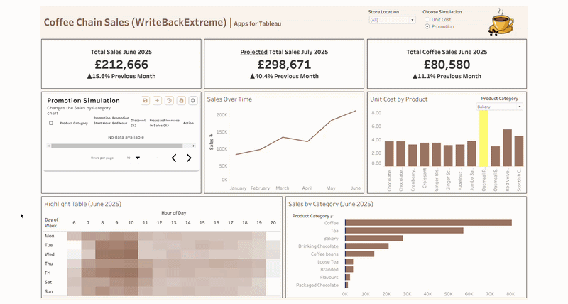 Adding this into the WriteBack will update our Sales by Category chart and we can see the new projected promotional sales for the Tea category. The change seems small but the projection will only increase or decrease the sales between the selected hours.