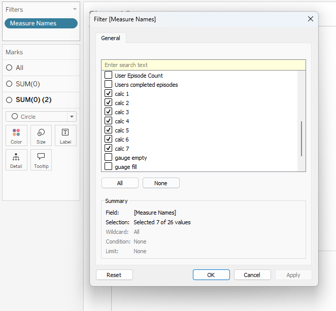 - Drag Measure Names to Filters and select only the calculations created in Step 2.