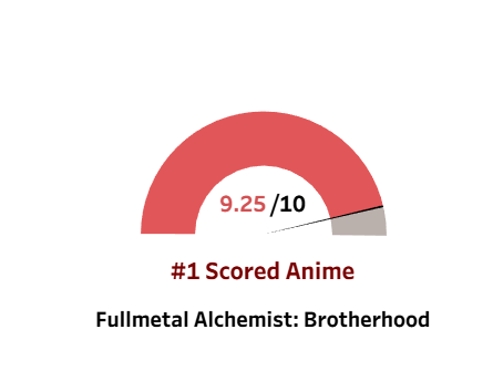For my dashboard, I wanted to feature a gauge chart to display the score of the highest-rated anime title — serving as a simple, eye-catching KPI element.