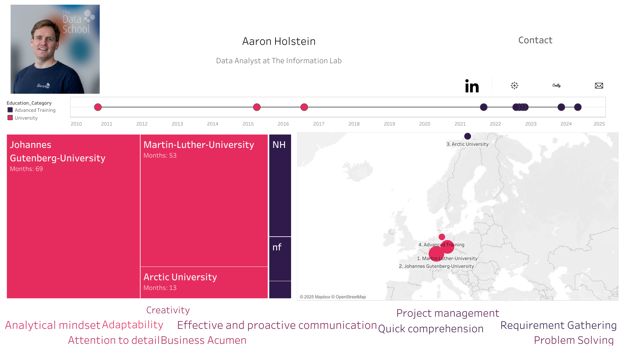 Today's task was of transforming one's own CV into a dashboard version, publish it on Tableau Public until 16hrs. and present it to our collegues in the office and MS Teams room.