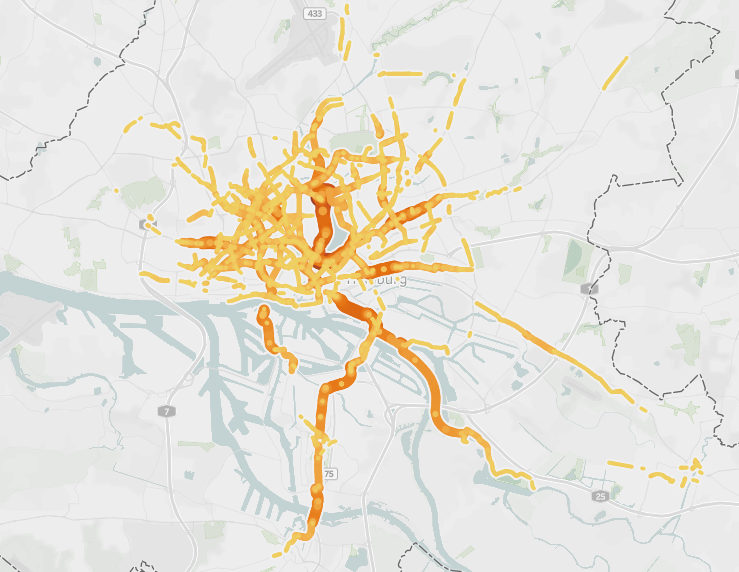 It became clear that visually mapping, filtering and aggregating would be the main part to identify significant cycling areas in Hamburg. Here for example you can see the main routes per cyclist volume in Hamburg: