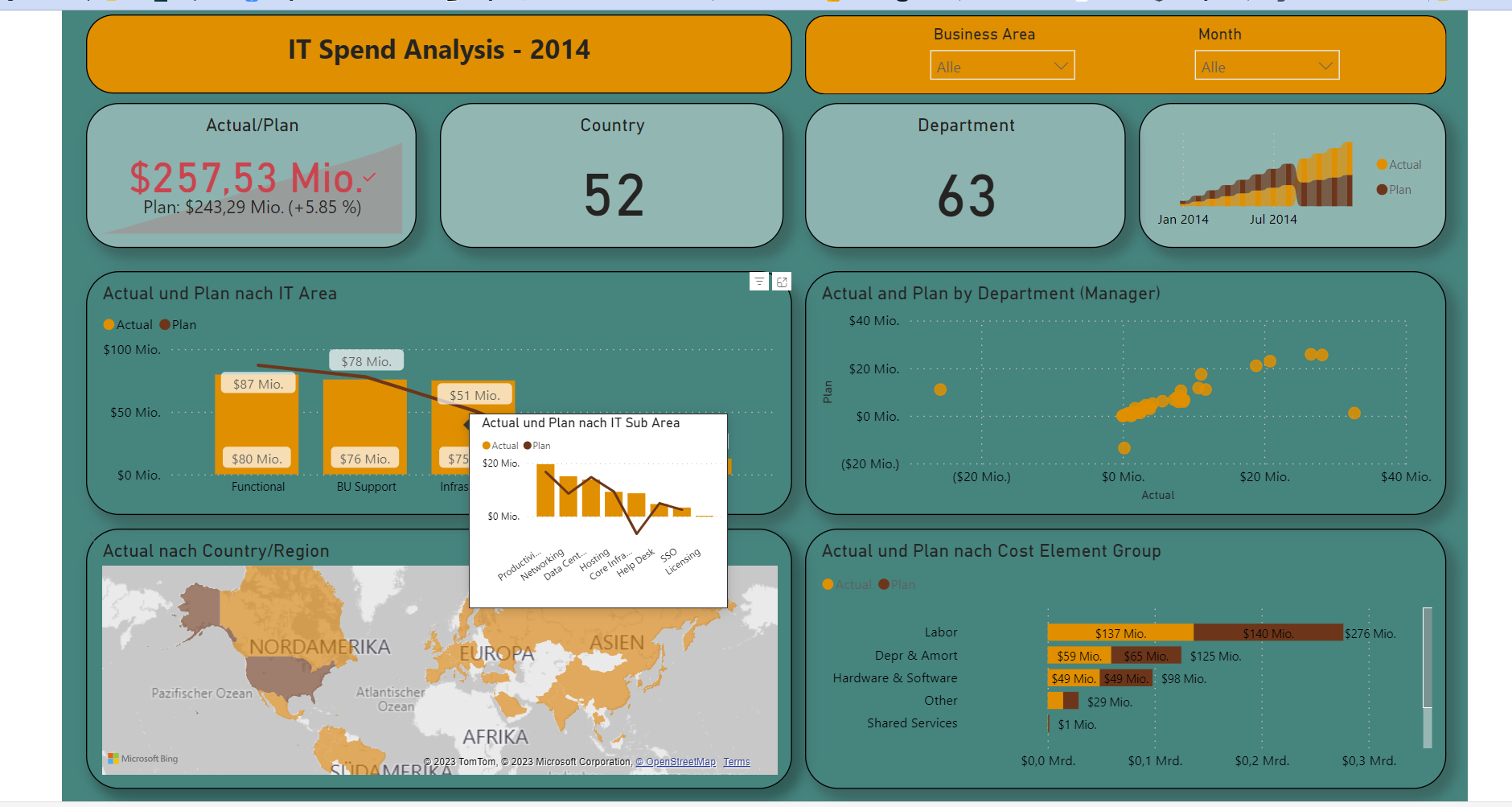 I chose the "IT Spend Analysis" data. With Power BI being such a great tool, I didn't have to do a lot of data cleaning or modeling. Power BI is really good at preparing data automatically. I just needed to understand the data and the calculations that were made. The data lists the company's expenditure for the IT department in detail, covering all departments, categories, subcategories, and periods.