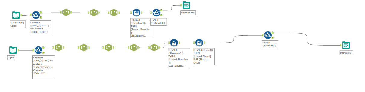 Initially, we needed to clean the data and merge all the files. This process consumed a significant portion of our planned time for the day. I used Alteryx for this task. I enjoy working with Alteryx, so preparing and cleaning the data was an engaging experience. Given that it's GPS-derived data, I primarily used regex to extract the necessary information. Ultimately, the results I achieved were closely aligned with the trainer's outcomes. It was then important to transform the routes into spatial data within Alteryx using spatial tools.