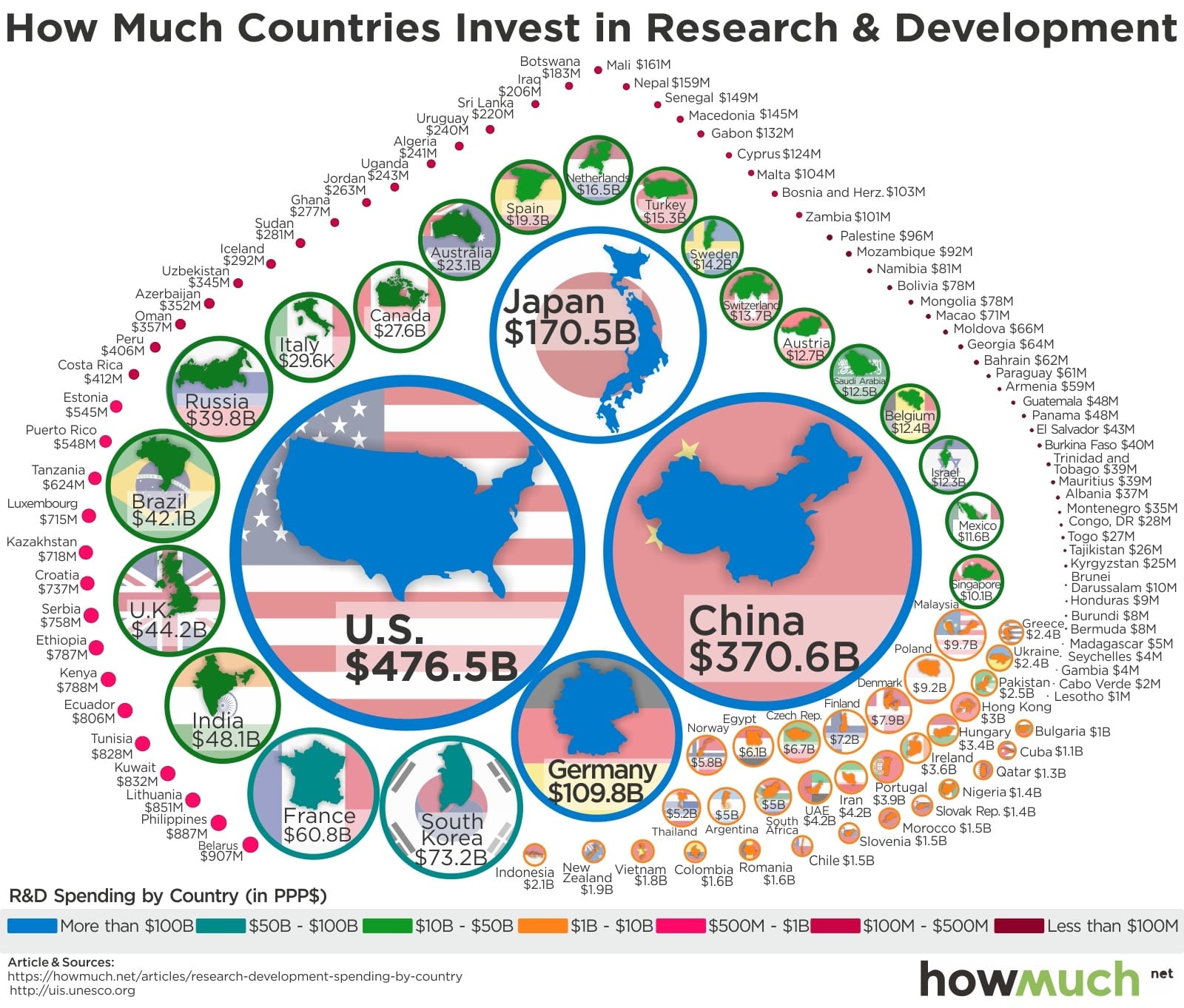 - Die GröĂe des Kreises um ein Land stellt die Höhe der Ausgaben dieses Landes dar.