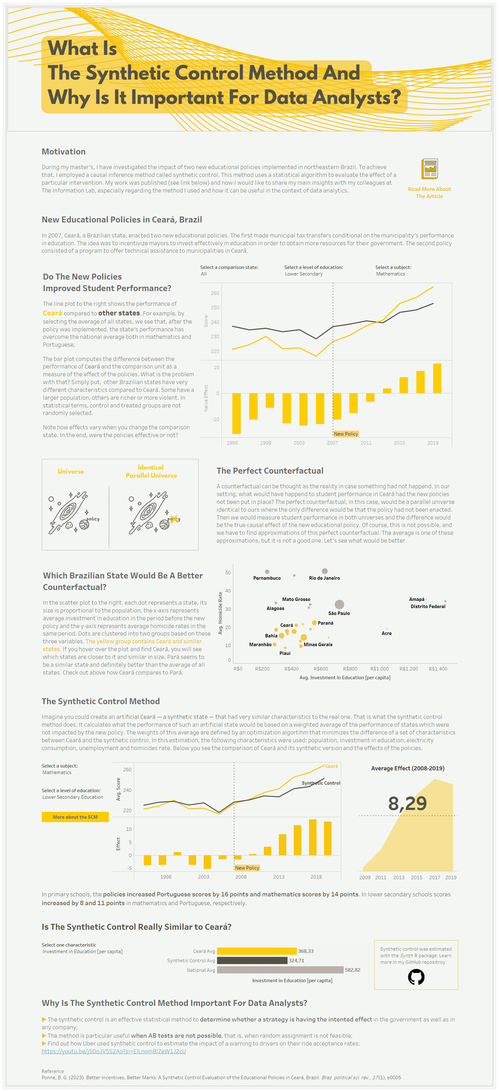 I chose to explain the method I used in my master's thesis through a Tableau dashboard. Basically, in my master's thesis, I studied the effect of two educational policies implemented in a Brazilian state. The objective was to assess whether the new strategies were, in fact, improving student learning.