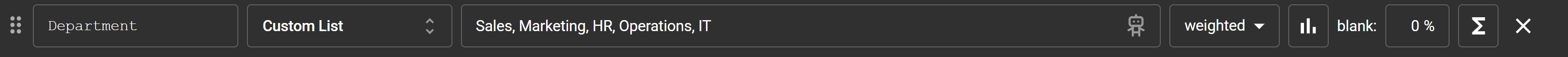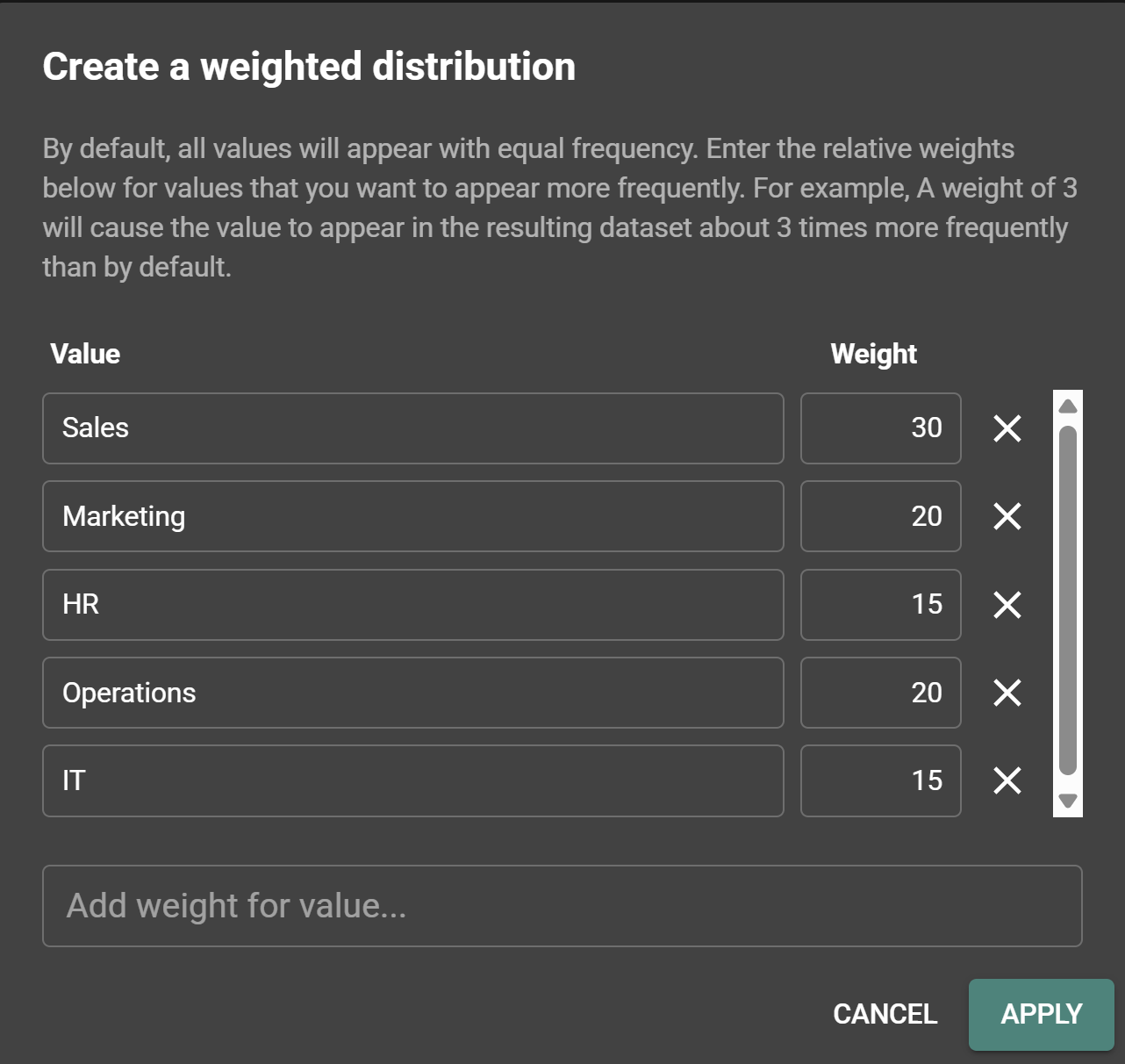 The weights let you control how often each value appears — making your data feel more natural.