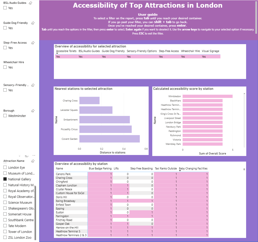 I sketched out a plan of what I wanted to show in my report based on the two datasets that we had and the scenario I was given. I tried not to be too ambitious after learning from my experience yesterday about the importance of scoping! I also had to remember that things that I know how to do in Tableau (mainly lots of the spatial stuff) may not be things that I am familiar with in Power BI so I adjusted my sketch accordingly. I decided against joining my two datasets which, in hindsight was probably an unwise decision. I think appending the two tables (or a cross join, I'm not sure what it's called in Power Query!) might have been more helpful with my vision further down the line so that's a lesson for next time. Putting everything together initially wasn't too difficult so progress was fairly smooth at that point, bar a few small bumps in the road like errors in my distance calculation that were eradicated by using the nearest 5 stations to the attraction as I had originally planned.