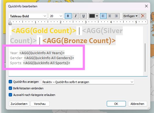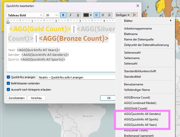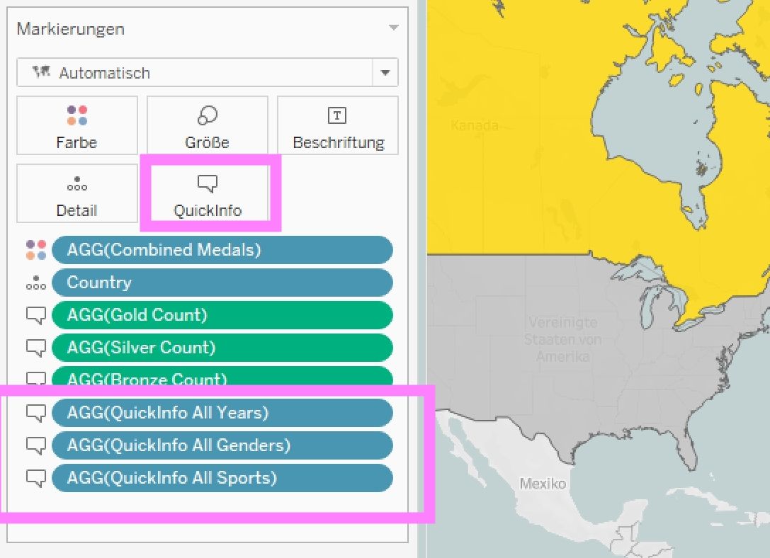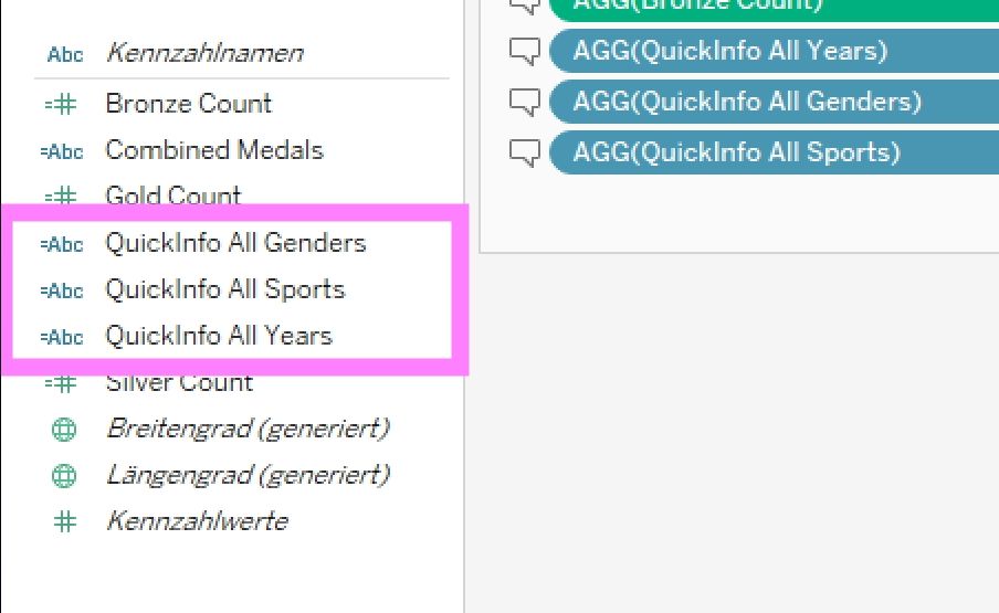 Jetzt binden wir die berechneten Felder noch in unsere QuickInfo ein. Dafür zieht ihr die Felder einfach nacheinander direkt auf das Feld mit dem Namen 'QuickInfo'. Sie sollten dann in dem Bereich darunter auftauchen und links das Sprechblasen-Symbol haben.