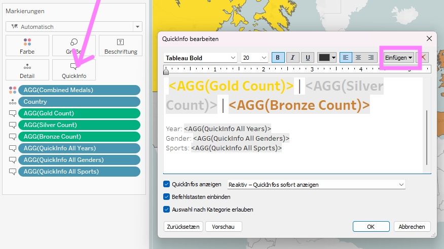 Danach klickt ihr auf das Feld 'QuickInfo' und im Pop-Up Fenster auf das Menü 'Einfügen'.