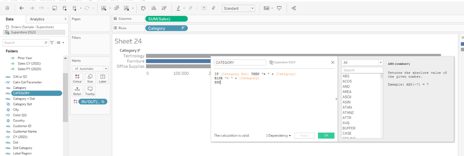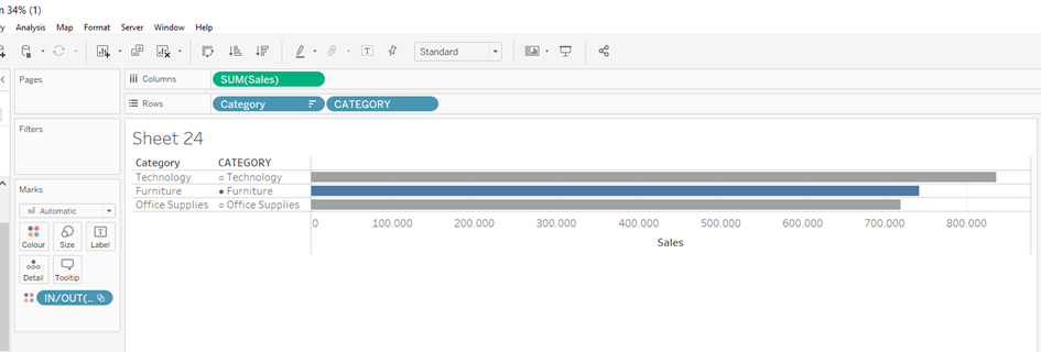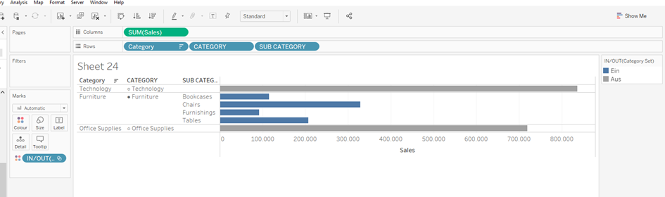 A calculating field for the Circle ●/○ follows and take the Sub Category from the Rows again: