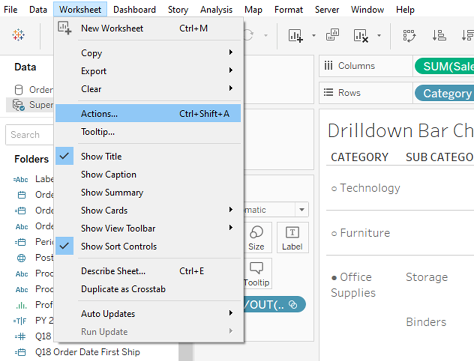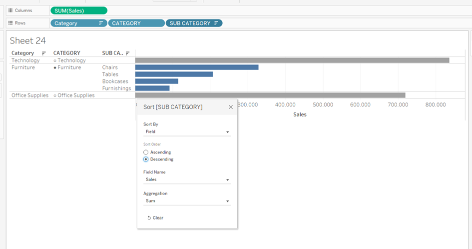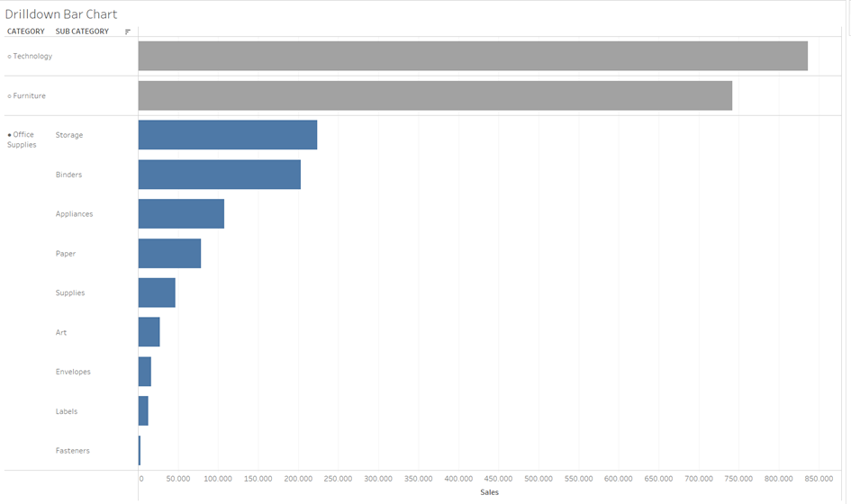 To get a Drilldown Bar Chart I sort the Sub Categroy field: