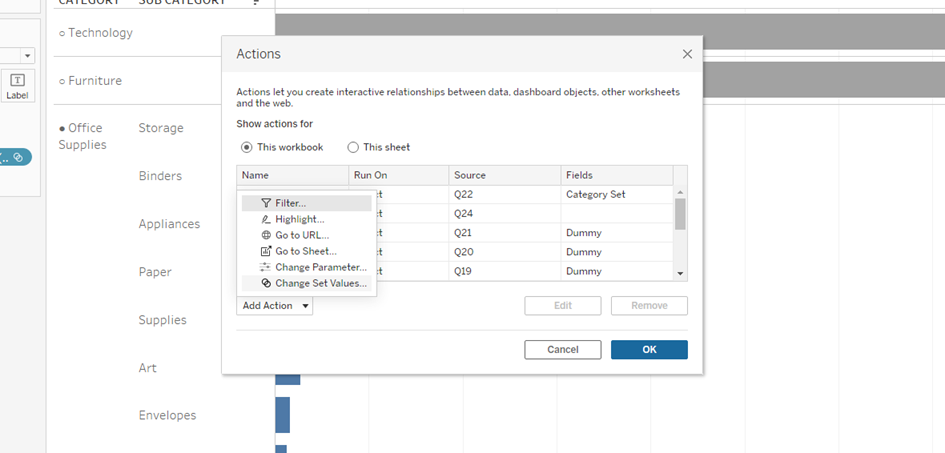 As a result, I want a bar chart where I can select a category. When I click on Furniture, my circle is filled in, my subcategory is colored and the other categories are grayed out. When I click on Technology, my circle is filled in... and so on