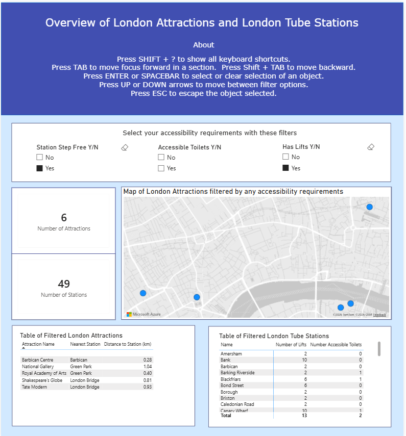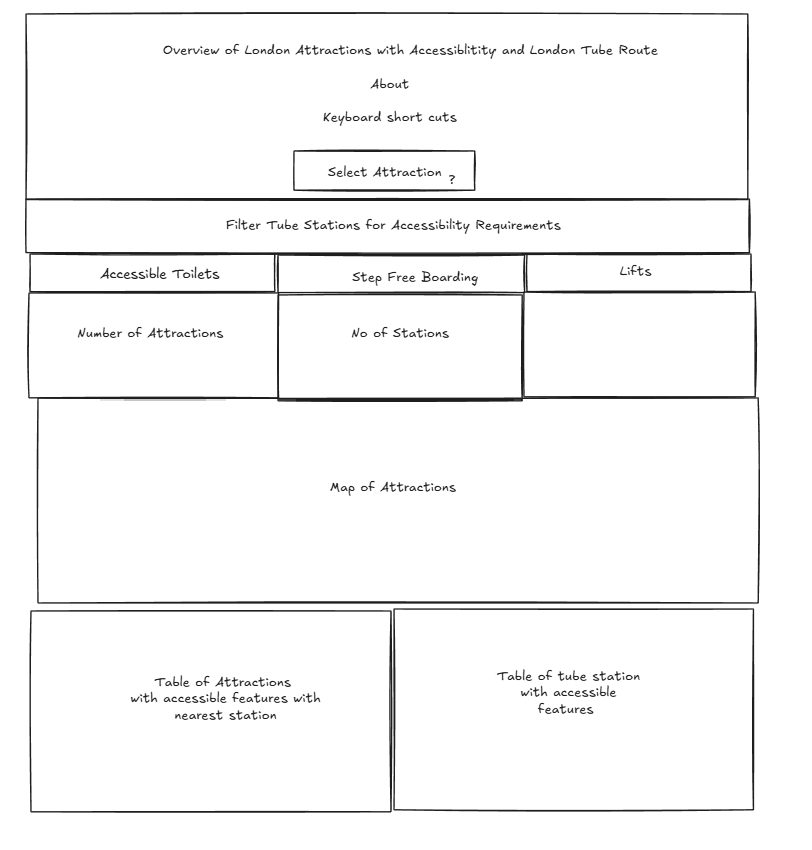 The brief was to build a screen-reader-compatible summary dashboard for London attractions and tube stations. For this to be a success, I had to meet some very specific requirements: