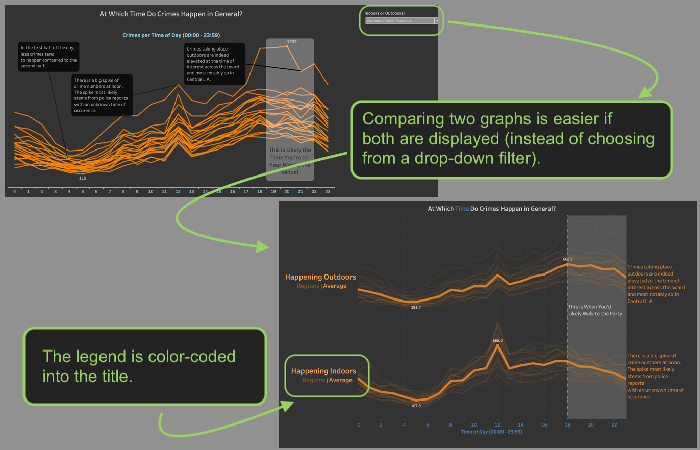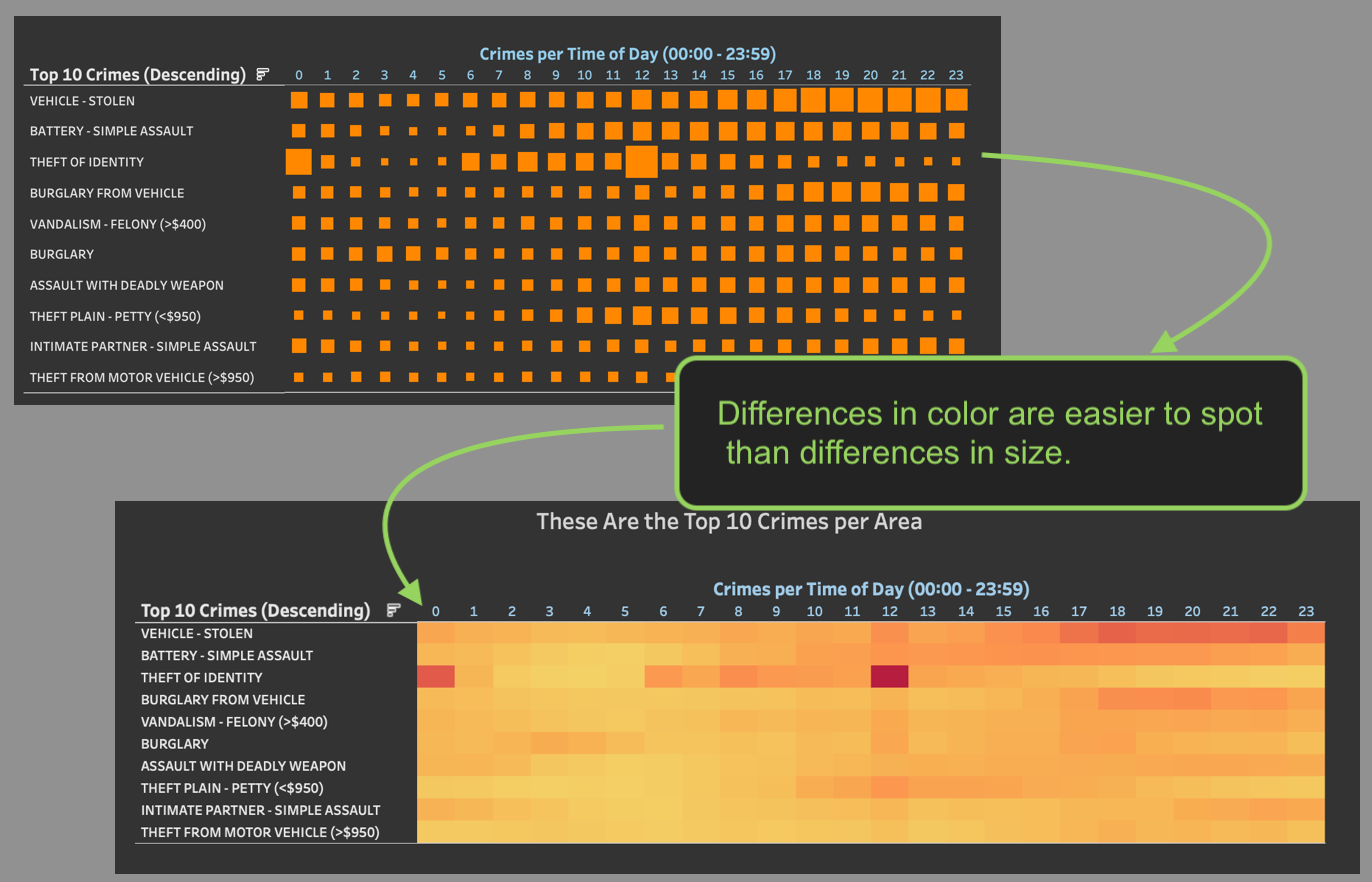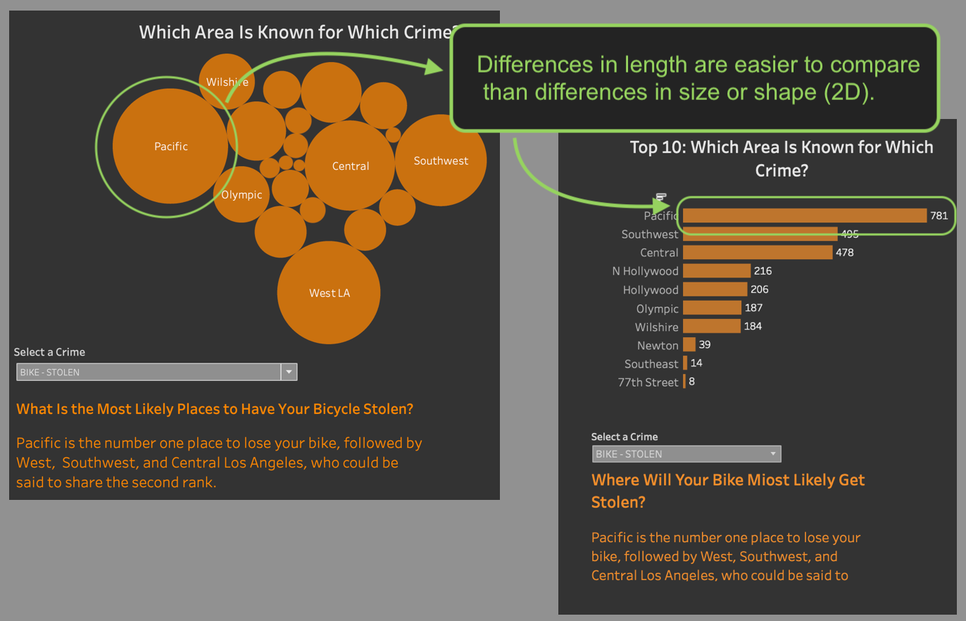 Let's pick out one of these bullet points, since the progress can easily be shown: Visualization best practices. The dashboard I initially built for The Dataschool (also my first outing to Tableau) can be found here and is built using crime data obtained via police reports from Los Angeles. The version on Tableau Public is updated already, because I've acted on some core concepts of visualization best practices already. One of them is to approach a dashboard from a perceptual perspective. Some aspects of a visualization stick out before others do. For example, difference in color are pretty salient and therefore should convey meaning. They also are more obvious than differences in the sizes of objects.