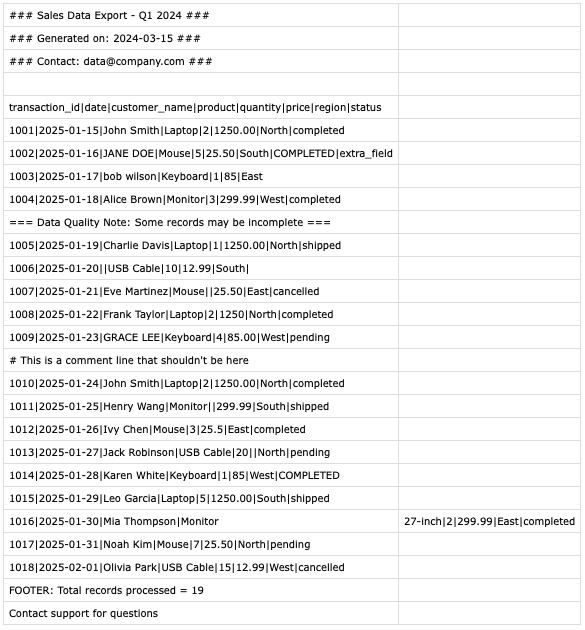 We've all probably struggled with a file like this before. Optimized more for the human eye than for ingestion tools.