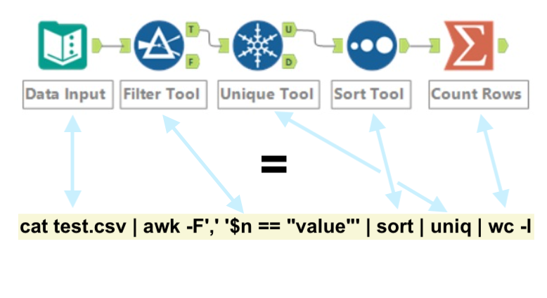 Unix pipes are multiple terminal commands chained together by the pipe operator ("|"), so that the output of one command feeds into the input of the next, very similar to what we know from popular data prep/ETL tools like Tableau Prep, Alteryx or Knime. They work out of the box on Linux or MacOS. You can download Git Bash to be able to run the Bash commands mentioned in this blog post in a Windows environment.