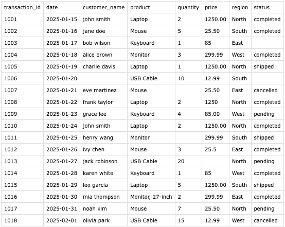 Let's now try something harder. For demonstration I've generated a csv file (God bless LLMs) that showcases some messy yet realistic transaction data: