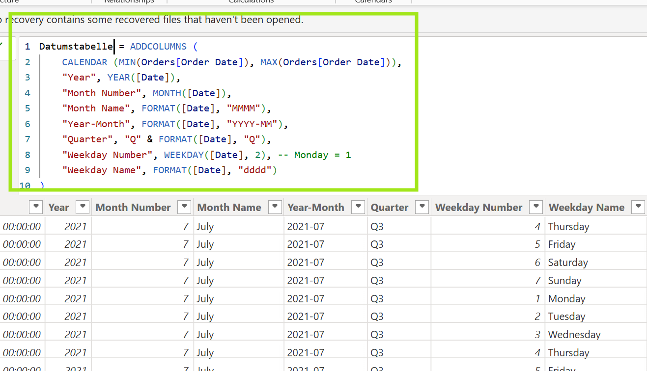 Wir haben bisher zwei unterschiedlichen Wegen gelernt, wie man die erstellen kann. Entweder mithilfe von DAX oder mit der M-Sprache im Power Query-Editor. Für diesen Beitrag konzentrieren wir uns auf die DAX-Methode, da sie deutlich einfacher und schneller umzusetzen ist.