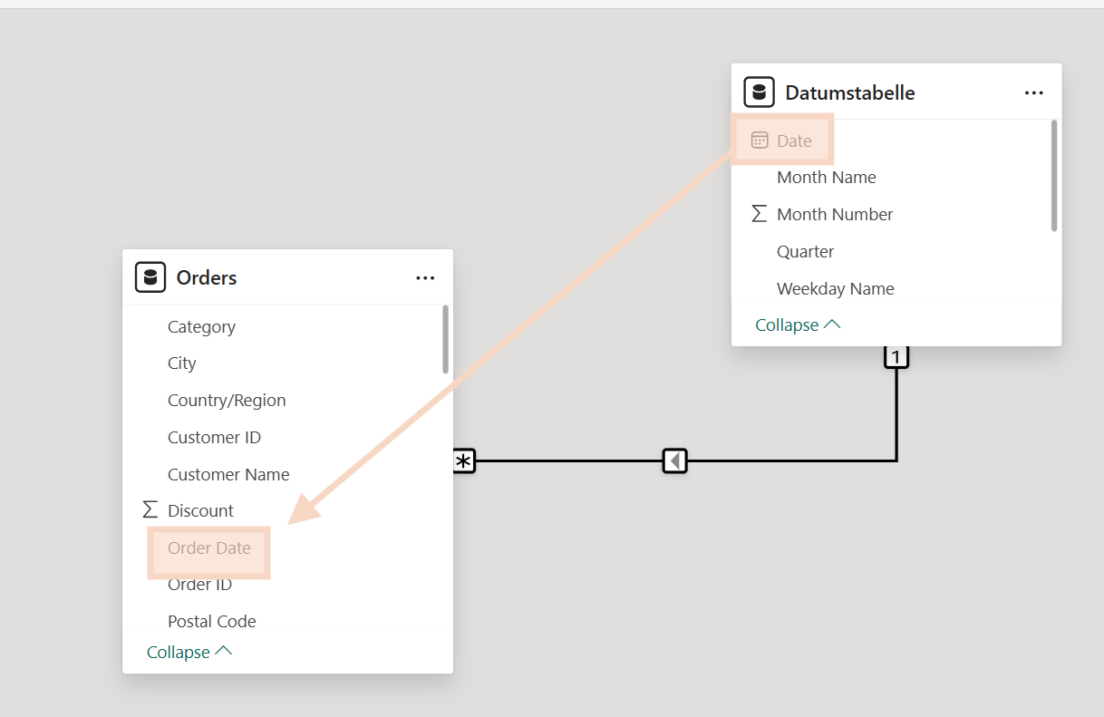 5.2 Ziehe die Date-Spalte aus deiner neuen Datumstabelle auf die entsprechende Datumsspalte in deiner Faktentabelle und Power BI erstellt automatisch eine Beziehung zwischen den beiden Tabellen.